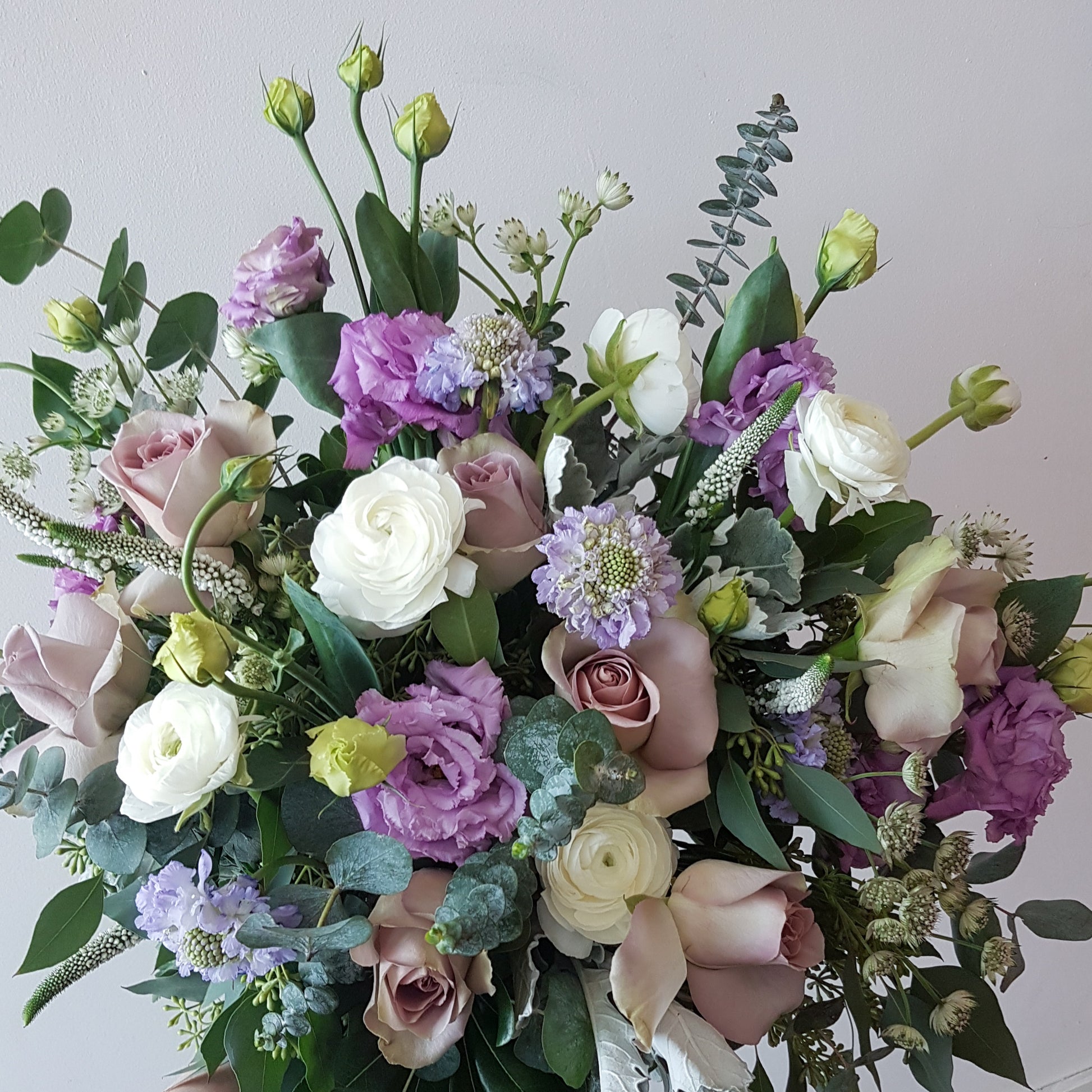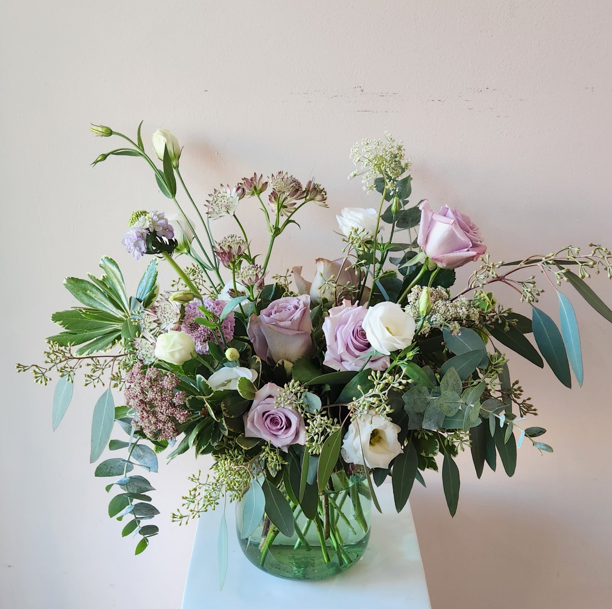 This hand-tied bouquet features a seasonal mix of light purple, white and assorted greenery. The above arrangement is valued at $135.