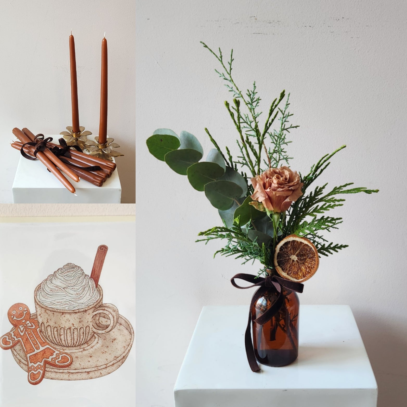 This hand-picked gift set features our Winter Warmth Bud Vase Trio, a toffee candlestick duo and a Gingerbread Latte Card by Keepsake Studio (blank inside, please leave a note while checking out if you would like us to write a message inside of the card for you).