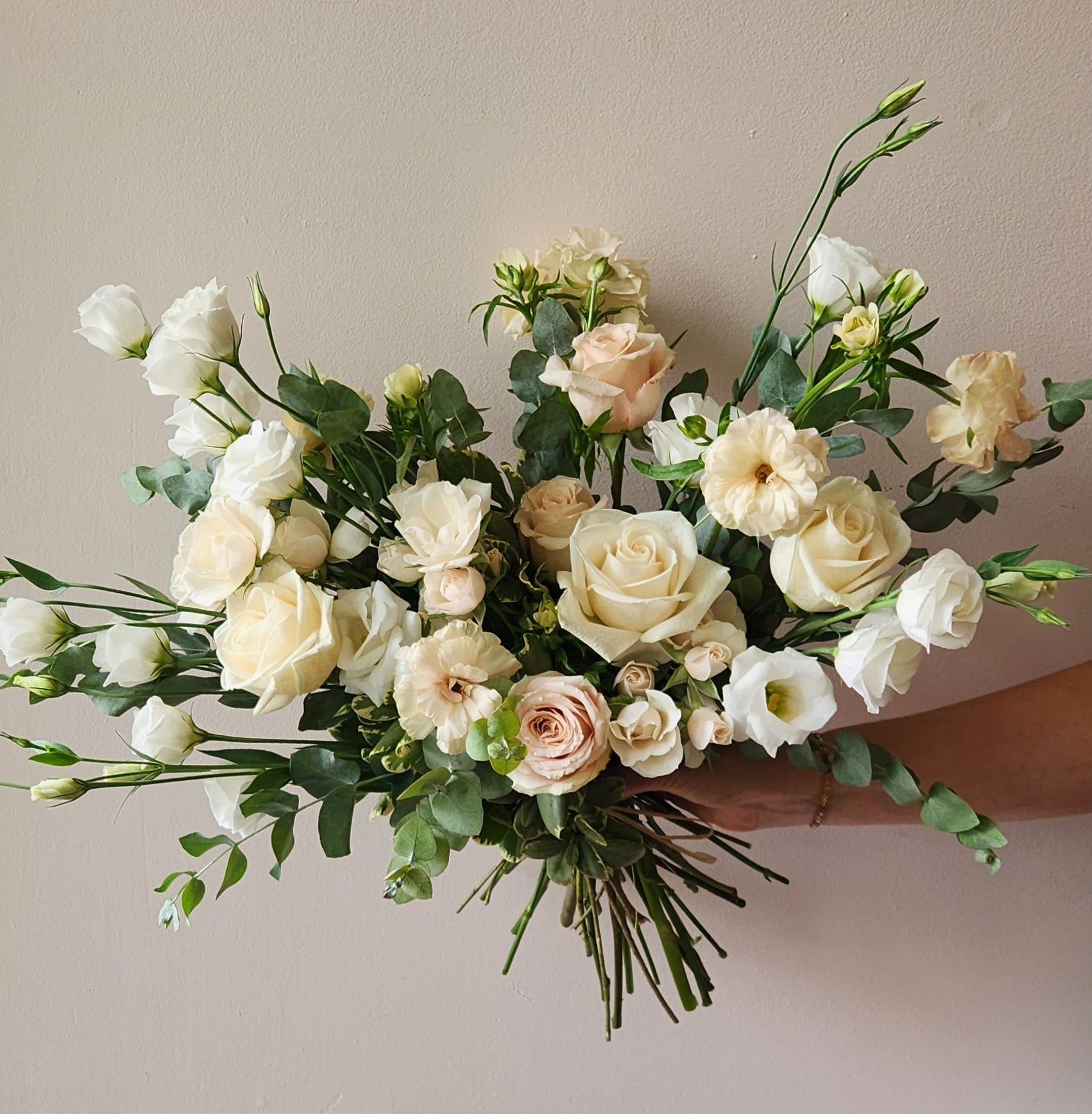 This hand-tied bouquet features a seasonal mix of blush pink, white and assorted greenery. The above arrangement is valued at $135.