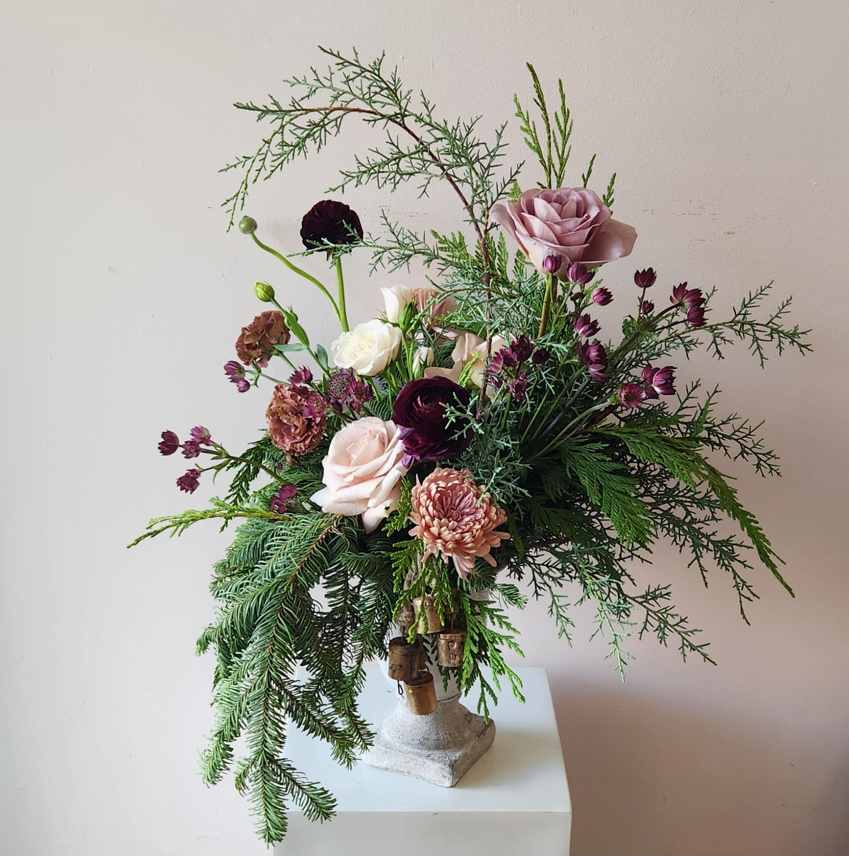 This arrangement features a seasonal mix of assorted winter greenery, vintage bells and a mix of dusty mauve, plums, blush and white blooms in a stone compote vase. The above arrangement is valued at $145.
