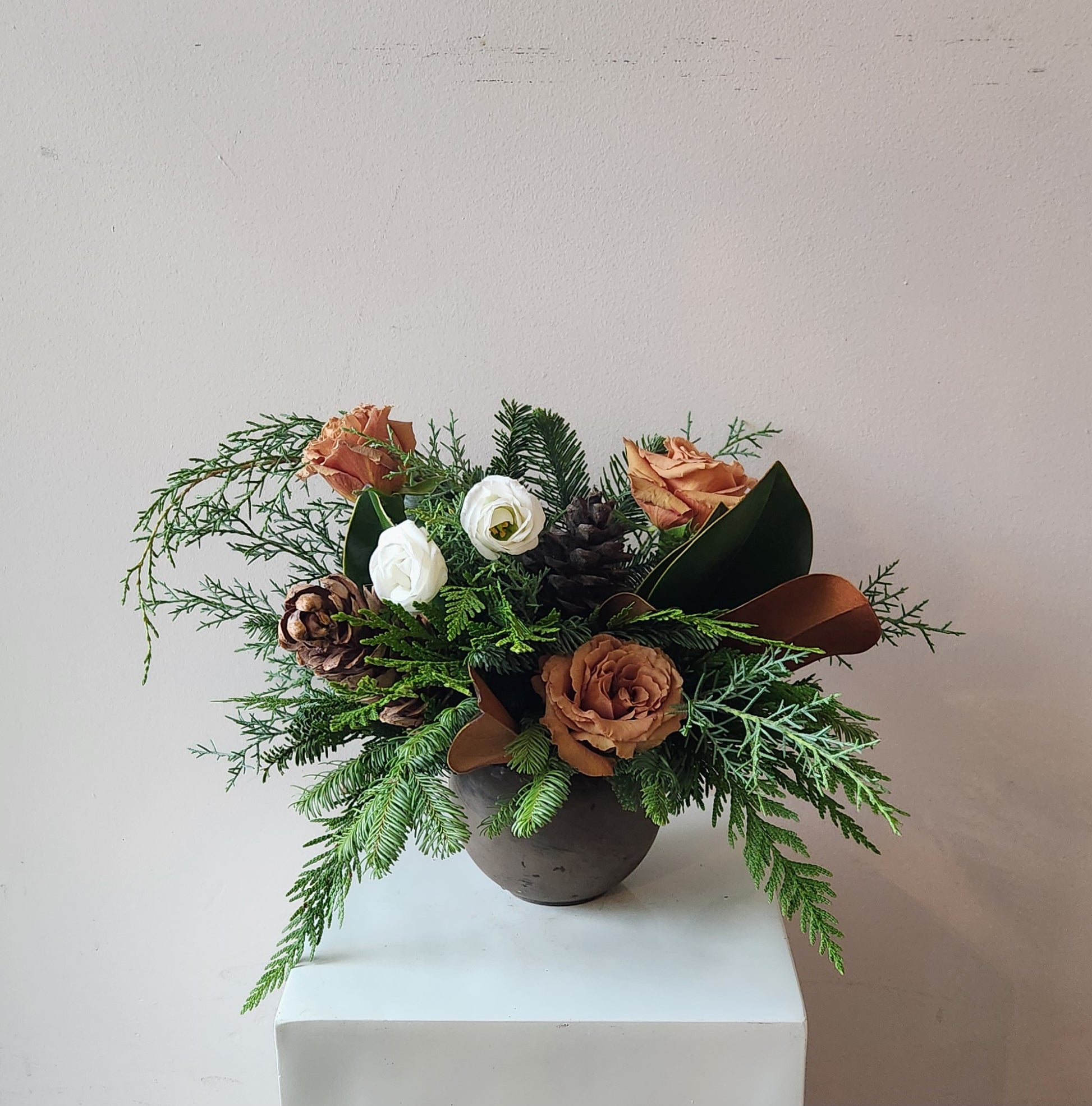 This petite arrangement features a seasonal mix of assorted winter greenery, pine cones and a mix of toffee and white blooms in small decorative vase. The above arrangement is valued at $65.